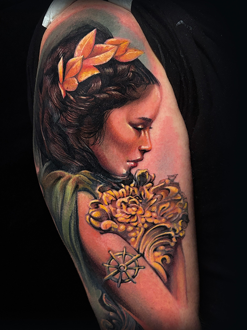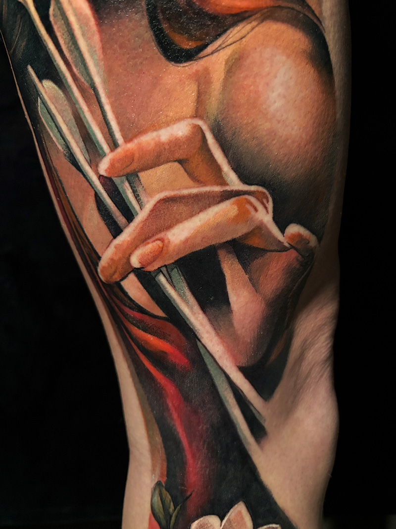 Estoy dándole muy serio al tema técnico. La composición siempre ha absorbido mucho tiempo en mi proceso creativo pero ahora lo hago de manera consciente para utilizar capas de color, veladuras, tener mi propia paleta de color y que sea distinguible en un tatuaje mío, que lo veas y lo reconozcas.