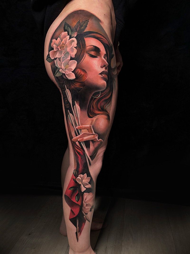 La pierna que le tatué a mi mujer y que la veo cada día, ja, ja, ja…Como olvidarla.